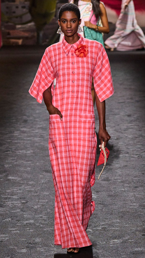 من المعروف أن طبعة المربعات مرتبطة بأجواء الخريف والشتاء، ولكن الغريب أنها احتلت مدارج العروض المخصصة لموسمي الربيع والصيف، حتى أنها غيَّرت جلدها وظهرت بألوان زاهية بعيداً عن النغمات الدافئة والترابية، فظهرت إحدى عارضات دار شانيل Chanel بفستان طويل مستقيم القصة يجمع بين اللونين الزهري والسيمون، ومصمم بأكمام قصيرة مفتوحة ومزود بجيب على الجهتين، نسقيه مع صندل وحقيبة باللون السيمون واختاري مجوهراتك من الذهب الأبيض.