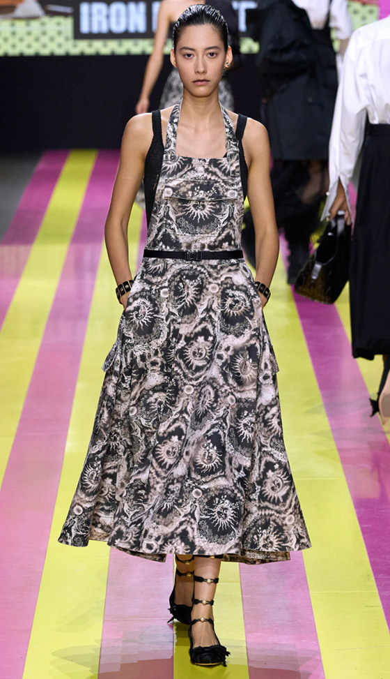 كما سبق وأشرنا إلى تركيز المصممين على الطبعات المستوحاة من الطبيعة، حتى إنهم استعانوا بعالم المجرات واستوحوا منه طبعات مميزة زينت الفساتين الميدي التي قدمتها دار كريستيان ديور Christian Dior ضمن مجموعة صيف 2024، لفتنا الفستان الذي جمع بين اللونين الأبيض والأسود والمصمم بياقة Halter وأعجبنا تنسيقه مع الحذاء الغلاديتور الأسود المسطح، تممي الطلة الفريدة بحقيبة دلو سوداء صغيرة.
