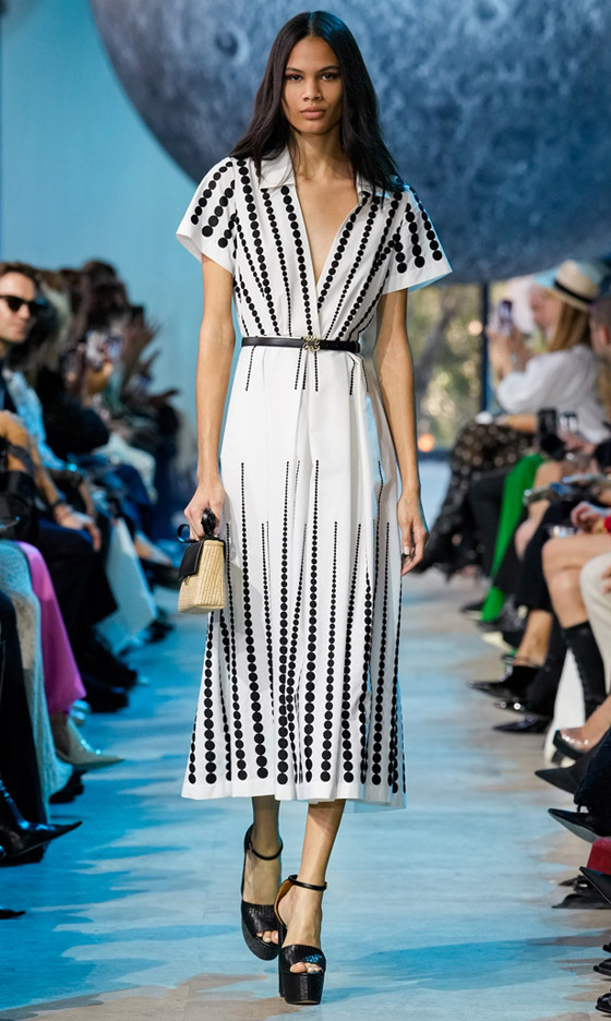 يبدو أن الفساتين المطبعة بنقاط البولكا ستكون من أساسيات أناقتك الصيفية هذا العام، فقد تكررت في أغلب عروض أشهر الدور العالمية، حتى إنها قُدمت في المجموعة الواحدة بأكثر من تصميم، فصادفنا في مجموعة المصمم إيلي صعب Elie Saab تصميمات تناسب النهار وأخرى للمساء، أحببنا منها الفستان القميص الأبيض متوسط الطول المنقط بالأسود، زينيه بحزام أسود رفيع، وانتعلي صندل Platform أسود واحملي حقيبة قش صغيرة على غرار العارضة.