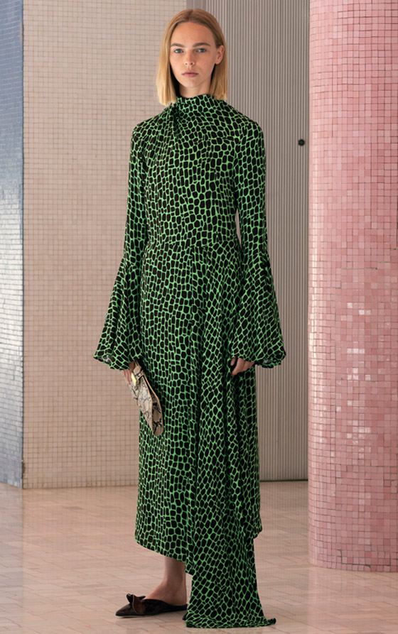 لم تخلُ مجموعات ريزورت 2024 من الفساتين المطبعة بالنقوشات البرية، وعلى الرغم من جرأتها المعروفة إلا أنها قُدمت بقصات محتشمة وساترة مثل الفستان الذي جلبناه لكِ من مجموعة ماركة MSGM والذي تميز بالقصة الواسعة والأكمام الطويلة التي تنتهي على شكل الجرس والياقة العالية والحواف غير المتماثلة، تفاصيل كثيرة تؤمن لكِ إطلالة تواكبين بها الكثير من الصيحات الدارجة باعتماد قطعة واحدة، نسقيه مع حذاء Mule أسود، واحملي حقيبة Pouch سوداء.