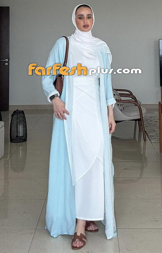لتحصلي على إطلالات مواكبة لآخر صيحات صيف 2024، عليك ملء خزانتك بالعبايات الباستيلية الناعمة، وعلى رأسها تلك المصممة باللون الأزرق الفاتح، اختاريها سادة خالية من أي تطريز، ونسقيها على طريقة مؤثرة الموضة ميسون الشيخ مع إطلالة بيضاء مكونة من بلوزة وتنورة Wrap طويلة، وغطي رأسك بطرحة شيفون بيضاء، وانتعلي Slippers جملِيّاً، وتممي أناقتك بحقيبة صغيرة من اللون نفسه. إطلالة أنثوية أنيقة يمكنك التأنق بها على مدار اليوم، ستزيد من طولك بفضل اللون الأبيض الموحد المنسق مع عباية فاتحة سادة مستقيمة القصة، كما تساعد التنورة الملفوفة حول الجسم في إخفاء منطقة الخصر الممتلئ.
