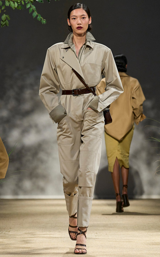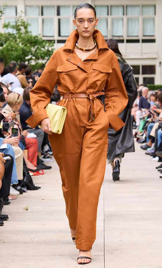 كما البناطيل، سطع نجم الجمبسوت المزود بجيوب كبيرة على الجهتين في صيف 2024، وأعجبنا الموديل المحتشم ترابي اللون الذي ظهرت به إحدى عارضات ماركة ماكس مارا Max Mara، نسقيه على طريقتها مع حزام بني داكن، واختاري الصندل والحقيبة الـCrossbody من نفس اللون، واعتمدي توربان بني داكن، أو اختاريه مزيناً بنقشات ناعمة على خلفية باللون البني الداكن.