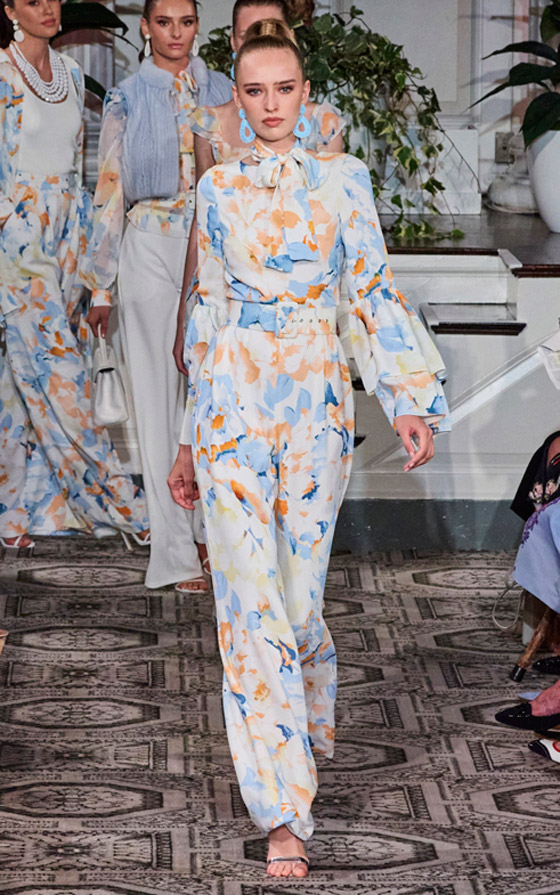نحن مغرمات هذا الموسم بطبعات الورود الزاهية التي ارتكز أغلبها على النغمات الهادئة والأحجام الصغيرة أو الرسومات المتداخلة بنعومة، كل ما سبق توفر بشكل مدروس في الجمبسوت المحتشم المصمم بأكمام طويلة تنتهي على شكل الجرس Bell Sleeves، والمزين بطبعات باستيلية على خلفية بيضاء، ومزود بحزام عريض من مجموعة دينيس باسو Dennis Basso، لائميه خلال المساء مع صندل أبيض، وزيني رأسك بطرحة شيفون بيضاء، وأكملي أناقتك بحقيبة Pouch باللون الأزرق الفاتح.