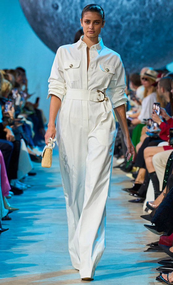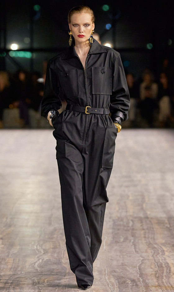 لن تستطيعي أن تستغني عن الجمبسوت الأسود هذا الموسم خاصة إذا كان يحمل توقيع ماركة كبيرة مثل سان لوران Saint Laurent، والتي قدمت ضمن مجموعتها للأزياء الجاهزة تصميماً فائق الأناقة تميز بلونه الأسود الملكي وقصته الواسعة والجيوب الكبيرة التي تزين التوب والبنطلون، وقد جاء مزوداً بحزام جلد أسود، وننصحك بتنسيقه مع توربان أسود مطبع بإحدى الرسومات البرية، وانتعلي صندلاً أسود، واحملي كلاتشاً ذهبياً، واختاري مجوهراتك من الذهب الأصفر.