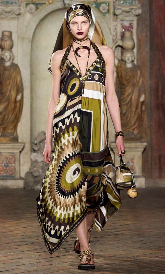 إذا كنت شقراء أو صهباء؛ فيجب أن تختاري في خزانتك الصيفية هذا الفستان المطبع بالألوان ذات رسوم هندسية بألوان العسلي والأخضر والبيج النيود، من تصميم دار إميليو بوتشي Emilio Pucci مع أكسسوارات ذات طابع قلبي.