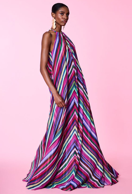 وقد اخترنا لك فستاناً من بادجلي ميشكا Badgley Mischka، وهو خالٍ من الأكمام، ويتسم بطابع مقلم بشكل جانبي؛ ليضيف الطول إلى قامتك. وتُعتبر توليفة الأقمشة والألوان الزاهية سحرية، وتتخذ طابعاً عصرياً يليق بذوات البشرة الداكنة.