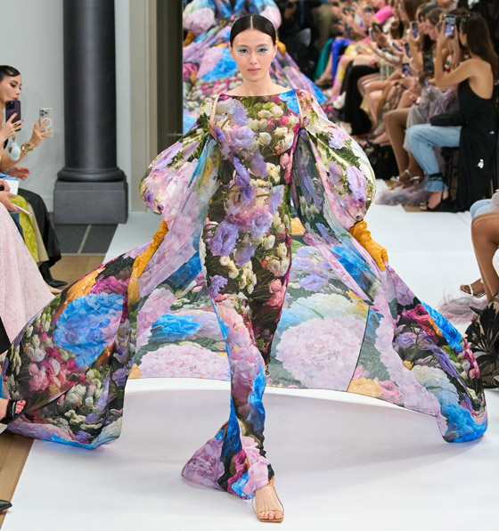 ومن وحي النباتات وزهور الطبيعة اخرتنا لك فستاناً طويلاً من الشيفون المطبع بزهور راقية ملونة، وهو مصحوب بوشاح شفاف من الشيفون بالطبعات نفسها. ويمكنك انتعال حذاء نيود عالٍ واعتماد تسريحة شينيون مشدودة إلى الوراء لإبراز جمال الزي وطبعاته التي تجسد لوحة فنية.