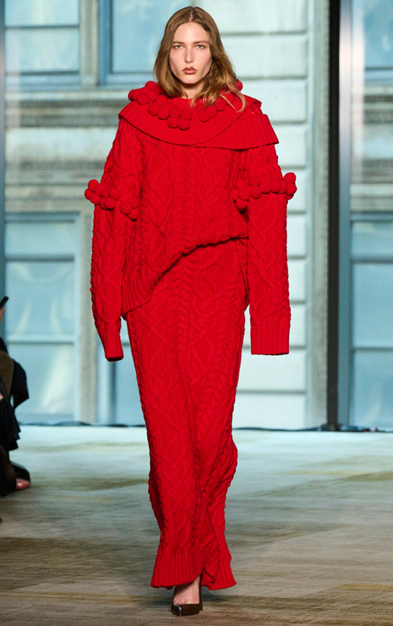 لم يغب الأحمر الجرئ عن عروض أزياء خريف وشتاء 2024 – 2025، فتكرر في أغلب المجموعات وقدمت منه إطلالات كاملة، من جهتنا أحببنا الطاقم الصوف المحبوك يدوياً الذي أطلت به عارضة ماركة Aknvas، والذي تألف من كنزة متوسطة الطول مميزة بأكمام الطويلة التي تغطي كف اليد والتنورة الطويلة مستقيمة القصة، نسقي هذه الطلة الشتوية مع بوت أسود برقبة متوسطة الطول، واحملي حقيبة دلو من نفس لون الحذاء.