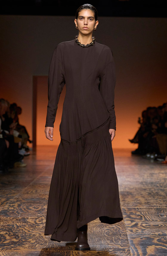 يواصل البني الداكن حضوره في خريف وشتاء 2024، بعدما سجل حضوراً قوياً على مدارج العروض العالمية، ستحبين مثلنا الفستان الطويل والمحتشم والمميز بحوافه غير المتساوية Asymmetrical Dress من مجموعة ماركة بوتيغا فينيتا Bottega Veneta، التصميم الذي نراه مناسباً لإطلالات المحجبات، يمكنك تنسيقه مع بوت طويل من نفس لونه، وأكملي اللوك باعتمار طرحة سوداء، واحملي حقيبة باللون الأحمر أو الأصفر المستردة، وارتدي مجوهرات من الذهب الأصفر.