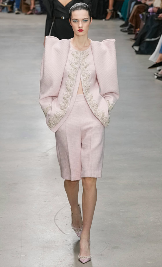 نافس اللون الوردي الفاتح بقوة؛ ليحتل مكانة بارزة ضمن لائحة صيحات الألوان الدارجة في 2025، اللون الذي ينسجم مع مختلف ألوان البشرة، وجدناه بكثرة في عرض ماركة كارولينا هيريرا Carolina Herrera حيث أطلت إحدى العارضات ببدلة تويد ذات تصميم عصري فريد؛ حيث أتت بجاكيت متوسط الطول مصمم بأكتاف بارزة ومزين بتطريز ناعم وشورت طويل يلامس الركبة بالكاد، نسقيها خلال المساء مع حذاء مدبب من نفس لونها، وتممي أناقتك بكلاتش فضي وأقراط متدلية من الذهب الأبيض.