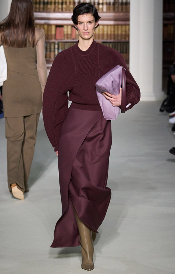 بمتابعة عروض الأزياء العالمية وحسابات مدونات الموضة على إنستغرام، ستلاحظين الحضور الطاغي للون البرغندي، ما يعني أنه سيكون نجم الشتاء المقبل، اللون المفضل لصاحبات الذوق الرفيع، قدمته ماركة جيادا Giada ضمن أحدث مجموعاتها، فظهرت إحدى العارضات مرتديه كنزة برغندية قصيرة بياقة مرتفعة وأكمام منفوخة منسقة مع تنورة Wrap طويلة من نفس لونها، وقد أحببنا تنسيقها مع البوت الطويل الأخضر الكاكي والحقيبة الأرجوانية الفاتحة، ستبدو أقراطك الناعمة المصممة من الذهب الأبيض رائعة على هذه الطلة.