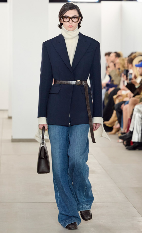 يذكرنا اللون الأزرق الداكن Navy Blue بالإطلالات المدرسية، لذا هو يناسب تماماً الأزياء الرسمية مثل المعاطف والجاكيتات، على طريقة عارضة ماركة مايكل كورس Michael Kors ارفعي من مستوى إطلالتك الكاجوال ونسقي الكنزة البيضاء مرتفعة الياقة والبنطلون الجينز الأزرق واسع الأرجل مع بليزر أزرق داكن طويل، وزيني خصرك بحزام جلد بني داكن، على أن يكون الحذاء والحقيبة من نفس لونه.