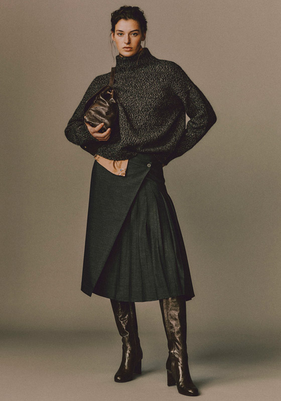 أهدتنا عروض الأزياء العالمية باقة واسعة من الأزياء المصممة باللون الرمادي المعروف برصانته وأناقته، اللون المفضل للكثيرات، أدرجته ماركة موموني Momoni بأكثر من طلة في مجموعة خريف وشتاء 2024 – 2025، ولكننا أحببنا الطلة المكونة من كنزة صوف قصيرة واسعة بياقة عالية وتنورة A Line مزينة في جانب منها بكسرات البليسيه، وننصحك بإكمال هذه الطلة الدافئة والراقية ببوت طويل باللون الأسود أو البني الداكن، واحملي حقيبة Pouch من نفس لون الحذاء.