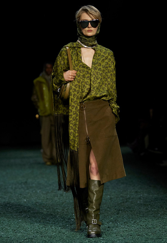 كالعادة حجز الأخضر الكاكي لنفسه مكاناً على مدارج العروض، وقُدمت منه قطع تفيض رقياً وفخامة تعدنا بموسم شتوي رائع، أعجبتنا التنورة الـA Line المزودة بسحاب أمامي ومزينة بشق من مجموعة ماركة بربري Burberry، والتي نسقت مع قميص أخضر مزين بطبعة Paisley الكلاسيكية وسكارف من نفس اللون والنقشة، تممي هذا اللوك الخريفي المميز ببوت كاكي متوسط الطول وحقيبة Baguette من اللون عينه.