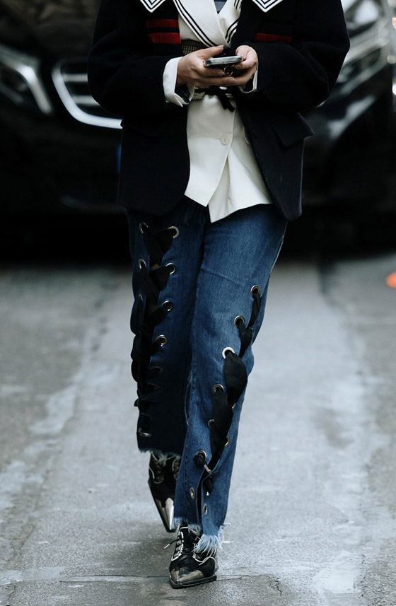 برزت هذا الموسم موضة البناطيل الجينز المطرزة أو المزودة بتفاصيل غريبة وغير تقليدية مثل الأربطة السوداء التي زينت بعض الموديلات، صيحة فريدة تحاكي ذوق الجريئات، ولكننا نرشحها بقوة للنحيفات الطويلات؛ فعلى الممتلئات القصيرات تجنبها لأنها ستزيد من عرض الجسم، وبالتالي ستجعلك تبدين أقصر مما أنتِ عليه.
