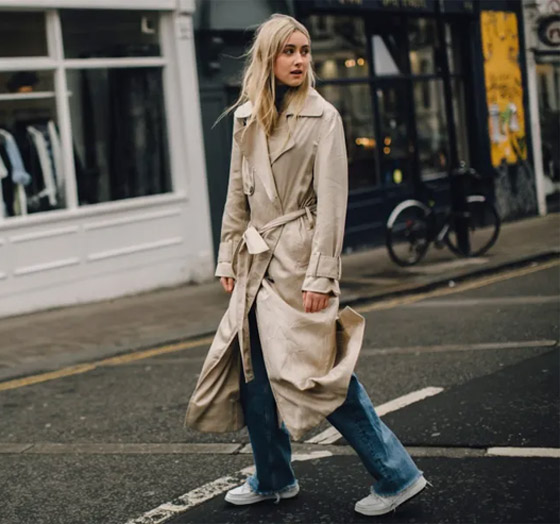 - البنطلون الجينز مستقيم القصة: تناسبه الأحذية الرياضية خاصة تلك المصممة بنعال مسطحة وغير عالية؛ لأنها ستظهر قصة البنطلون بشكل مرتب وأنيق، كما يمكنك انتعال أحذية الـLoafers الرائجة أو بوت دنيم برقبة متوسطة؛ لتحصلي على طلة موحدة اللون تزيدك طولاً.