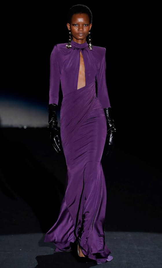 اخترنا لك هذا الفستان البنفسجي من تصميم مايكل كوستيلو Michael Costelloe، وهو مصنوع من الحرير ويتسم بأكمام طويلة وفتحة جريئة عند الصدر، وهو منسق بعناية مع قفازات من الجلد اللامع الأسود ويمكنك انتعال حذاء بكعبٍ عالٍ أسود. ويتسم الفستان بأكتاف محشوة وقصة مزمومة تظهر رشاقتك وهو منسدل بحرية كلما اتجهنا نحو الأسفل. ويمكنك التزين بأقراط طويلة لإضفاء طابع راقٍ على الزي.