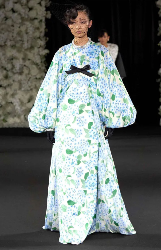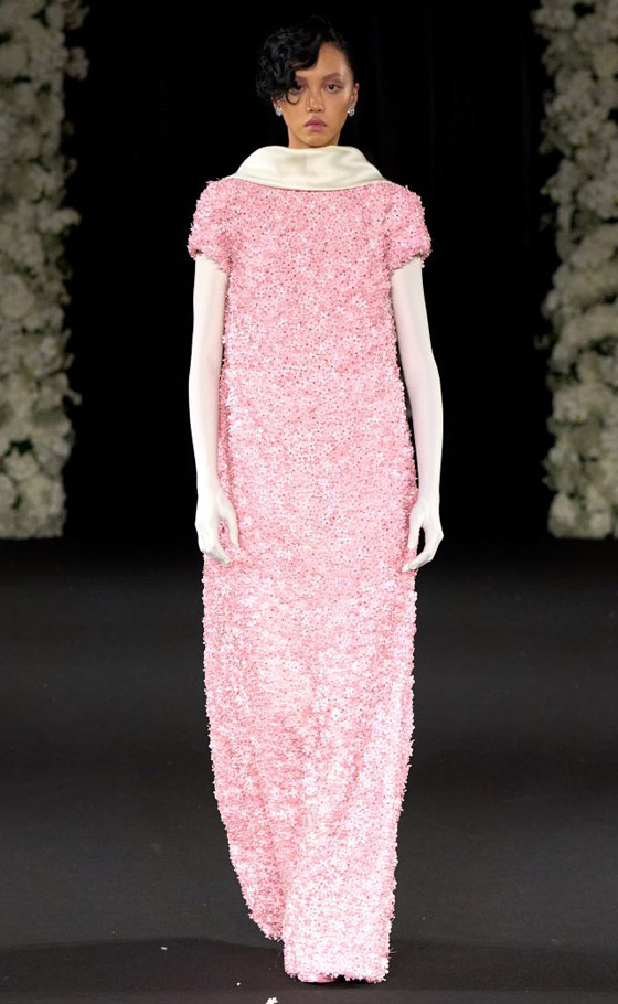 هو فستان بطابع أوبرالي ويتسم بقصة منفذة من الورود الزهرية المنمقة المثبتة بإحكام وغزارة على كامل التصميم المستقيم والذي يتمتع بأكمام نصفية تتوجها قفازات الأوبرا الساتانية الطويلة والتي تأتي لتضفي انطباعاً بأنه بأكمام طويلة. الفستان من توقيع المصمم البريطاني ريتشارد كوين Richard Quinn.