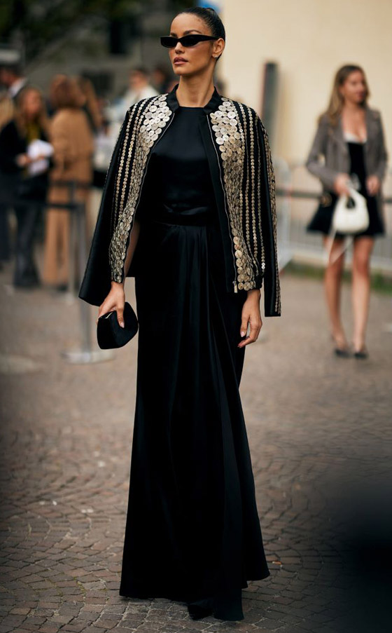 فستان أسود مع سترة بوليرو ميتاليكية: