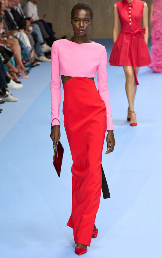 هو فستان رائع من كارولينا هيريرا Carolina Herrera، بطابع كولوبلوك يتمثل في اعتماد لونين معاً وهما الكرزي والزهري الباربي في فستان واحد يتسم بتقنية مفرغة عند الخصر مع تنورة عالية تنحدر من تحت الصدر لتضفي المزيد من الطول إلى ساقيك في حال كنت تعانين من ساقين قصيرتين فيعتبر هذا التصميم مرادك. ويمكنك انتعال حذاء باللون البرغندي أو الكرزي ويُفضل من الساتان بكعب عالٍ، ويمكن تنسيق حقيبة على شكل مغلف Enveloppe Bag.