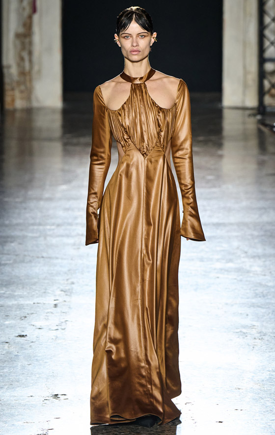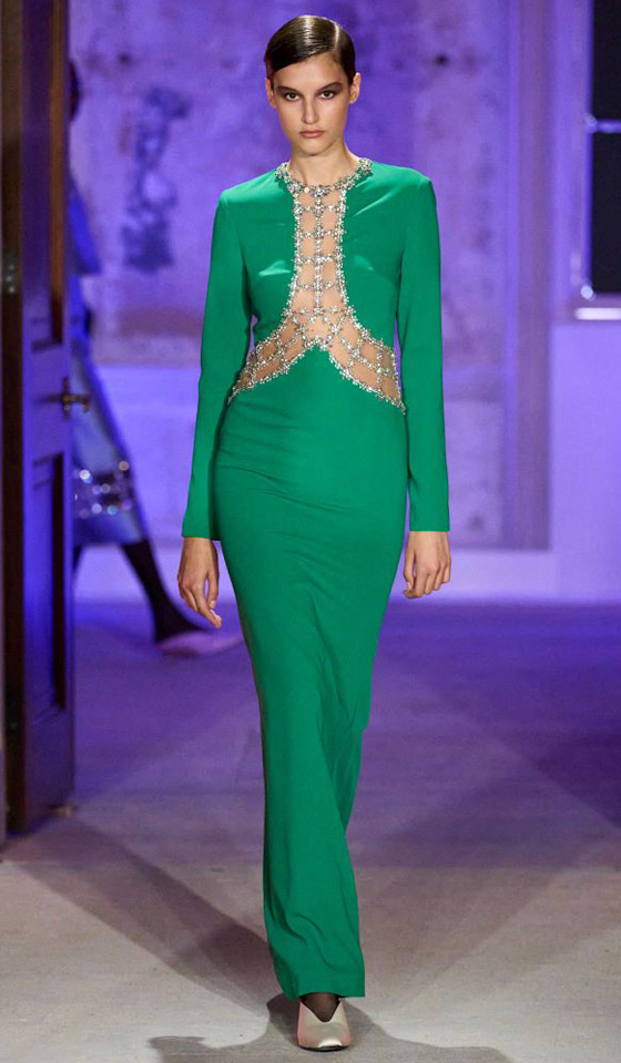 وهو فستان مثالي للنحيلات والقصيرات من هويشان زانغ Huishan Zhang، لأنه يمنحك الطول بقصته الضيقة وأكمامه الملتصقة بالجسم كما أن فتحته الجريئة عند البطن والصدر تفترض قواماً يشبه الساعة الرملية لتكون النتيجة مثاليةً. وننصحك باعتماد تسريحة مينيمالية مع هذا الفستان وانتعال حذاء أخضر رائع بقصة مستقيمة وضيقة، لكي تبتعدي عن الروتين.