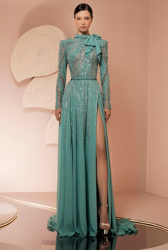 كما صمم المبدع زياد نكد فستاناً أزرق بلون الباستيل من الكريب الحريري المطرز عند الياقة بأحجار كريستالية لامعة، ويتسم بأكتاف محشوة وأكمام طويلة وضيقة، فيما تنسدل التنورة لتلامس الأرض. وتتميز الأكمام الشفافة بتطريز غني بالأحجار الفضية البراقة، وتعلو الياقة فيونكة جانبية أضفت لمسةً ملكيةً على الفستان. ويُناسب هذا الفستان متوسطات القامة لأن أكتافه المحشوة وفتحته العالية تمنحانك المزيد من الطول.