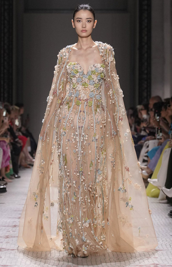 كما سحرنا هذا الفستان النيود من إيلي صعب، المصنوع من التول الشفاف المبطن بقماش بيج وهو مطرز بأحجار ذهبية وعاجية وزرقاء ياستيل ويجسد الزهور والنباتات بأشكال عامودية لمنحك المزيد من الطول، وهو منسق مع كاب منفذ من القماش المطرز نفسه، وهو مثالي لحضور زفاف ملكي لروعة تفاصيله وتصميمه المتقن. ويعتبر هذا التصميم مثالياً للطويلات فالفساتين المزودة بالكاب تخفي ضخامة الكتفين البارزتين وهي تليق بالطويلات.