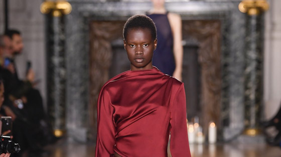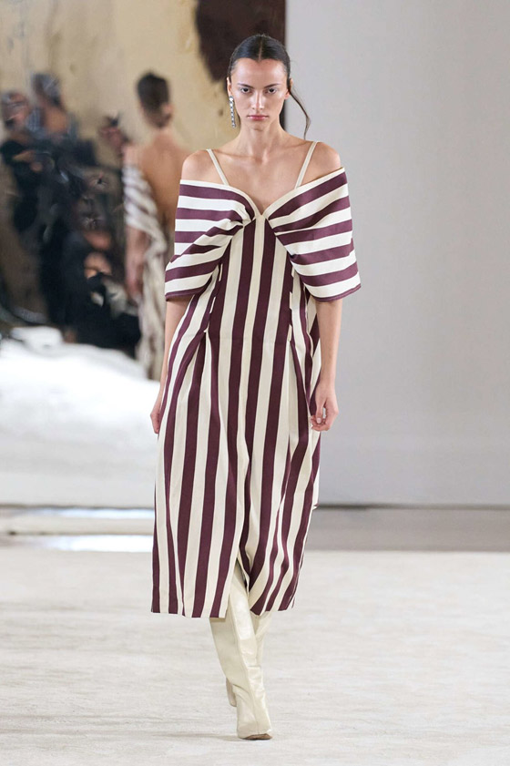 عادة، يجمع مصممو الأزياء البرغندي مع الألوان الغامقة، لأنه لون داكن ودافئ للغاية، بينما في هذه الإطلالة من «ROMEO GIGLI»، ظهر هذا اللون الساحر بطريقة غير تقليدية، حيث تألقت العارضة بفستان كلاسيكي مقلم، يجمع بين اللونين البرغندي والأبيض، وبكمين قصيرين، فتشبه الفراشة، ليسجل تنسيقاً مميزاً، وغير معتاد على هذا اللون.