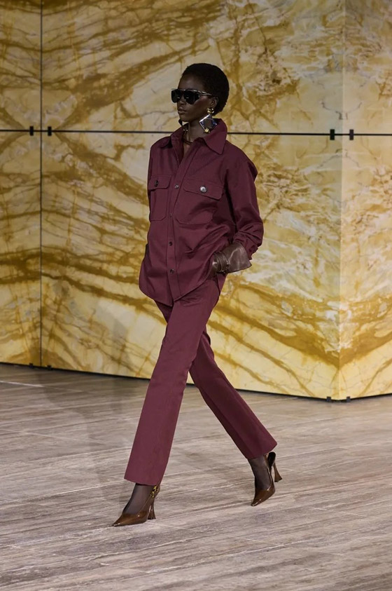 يعد اللون البرغندي اختياراً مثالياً في الإطلالات العملية اليومية، حيث يلهمكِ أكثر من تنسيق ومظهر. فهذه الإطلالة المُنسقة بأسلوب المونوكروم، من «Saint Laurent»، مثالية للمرأة العاملة الأنيقة، التي ترغب في إضافة لمسة من العصرية إلى مظهرها اليومي، ويمكنكِ تنسيقها مع الإكسسوارات الذهبية القوية، وحقيبة وحذاء باللون البني، أو الأسود، للظهور بـ«لوك» خريفي رائع.