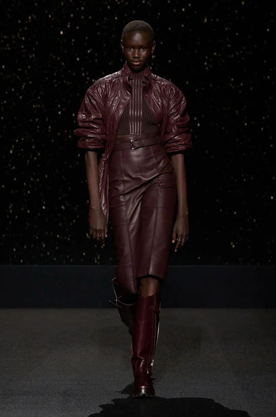 «Hermes» قدمت، أيضاً، هذا اللون الغني الفريد من نوعه، في مجموعة من الإطلالات، ومن بينها هذه الإطلالة الجريئة التي تحتاج إلى المزيد من الشجاعة، إذا تأتي بأسلوب المونوكروم بقماش الجلد. وأطلت العارضة بقطع مميزة من البرغندي، فارتدت كنزة صوفية، ونسقت معها جاكيت جلدياً طويلاً وتنورة «ميدي»، مع حذاء طويل بكعب عالٍ، ما يمنحها القوة والتأثير.