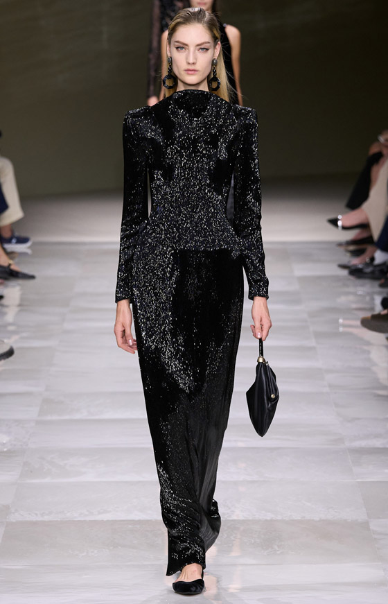 يأتي اللون الأسود في مقدمة ألوان فساتين السهرة التي لا غنى عنها في خزانة كل امرأة، ويمكن أن يكون بتصميم بسيطة وقماش برّاق يمنحه فخامةً ورقياً، مثل فستان أرماني بريفيه Armani Prive الأسود بالتصميم المناسب للمحجبات، فهو بأكمام طويلة وياقة مرتفعة وتنورة عمودية لا تكشف الجسم، وقد ظهر البريق بشكل ملحوظ على الفستان، ليمنح المرأة المحجبة سحراً خاصاً، وتكتمل أناقته مع الحذاء الأسود والحقيبة الصغيرة باللون الأسود.