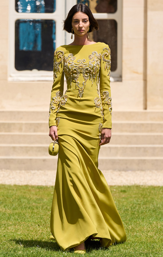 تميل كثير من النساء لاختيار فساتين سواريه بألوان أكثر حيوية بعيداً عن الألوان الداكنة، وخاصةً من تملك قواماً ممشوقاً تريد أن تبرزه وتحدده، وليكن هذا التصميم مثالياً لتلك المرأة المحجبة التي تبحث عن فستان بلون الأصفر الكناري الجذاب وقصّة تحدد خصرها وانحناءات الجسم، وهو من توقيع المصمم جورج حبيقة Georges Hobeika، يتسم بالبساطة والرقي بفضل التطريزات اليدوية التي تُزينه على الصدر وجانبي الخصر والأكمام، مع تصميم يبرز نحافة الخصر وتنورة تتسع من أسفل، وزاد سحراً مع حقيبة صغيرة وحذاء بنفس اللون.