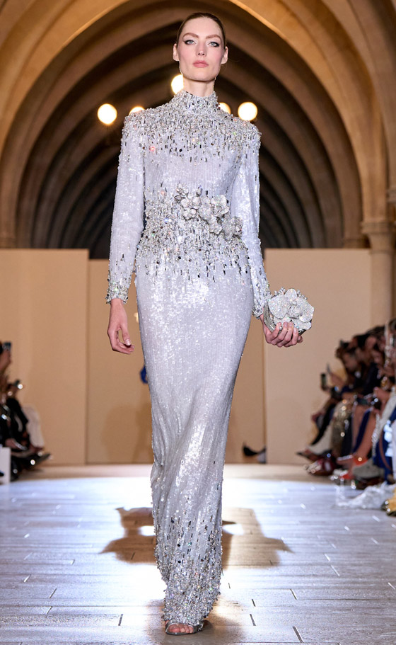 تُعد الألوان الميتاليكية خياراً مثالياً لفساتين السهرة، والتي تمنحك إطلالة جذابة ولافتة للأنظار، وخاصةً اللونين الذهبي والفضي، ويمكن للمحجبات اختيار فساتين سواريه بسيطة بألوان ميتاليكية مع قصّات ناعمة وتطريزات تزيد من فخامتها، مثل فستان تمارا رالف Tamara Ralph بدرجة هادئة من اللون الفضي مزيناً بالخيوط البرّاقة والتطريزات التي تُزين الصدر والخصر والأكمام الطويلة والتنورة، مع لمسة جذابة بالورود البارزة التي تزينه، وحقيبة كلاتش بتصميم الوردة.