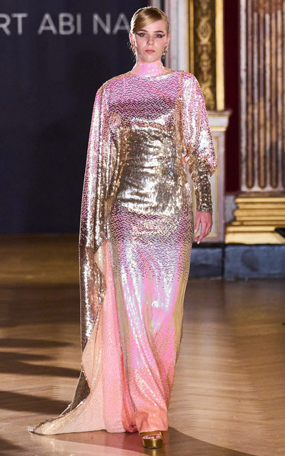 يرمز اللون الوردي إلى الأنوثة، ويزداد سحراً عند مزجه مع اللون الذهبي الذي منحه لمسةً فاخرةً، فما رأيك في فستان سواريه يجمع بين اللونين، كهذا الفستان من توقيع المصمم روبير أبي نادر Robert Abi Nader بالقماش اللامع والقصّة التي تُناسب المحجبات، حيث الأكمام الطويلة والياقة المرتفعة مع لمسة مميزة بالوشاح الطويل الذي يبدو مثل الكاب على أحد الجانبين وينسدل حتى نهاية الفستان، مع قصّة عمودية تمنحه بساطةً ونعومةً، ونسقت معه الحذاء الميتاليكي الذهبي.