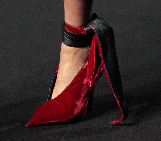 المخمل هو من أرقى وأفخم الأقمشة التي تناسب موسم الاحتفالات، حيث يضفي على الإطلالة لمسة من الفخامة والرفاهية. فما بالك بهذا التصميم الجميل من موغلر Mugler، الذي يتميز بأسلوب كلاسيكي، مع لمسات عصرية تجعل منه خياراً مميزاً. ما يلفت الأنظار حقاً في هذا التصميم هو الرباط الأحمر والأسود الذي يلتف حول الكاحل بأسلوب أنيق؛ ما يضيف لمسة من الجاذبية والتفرد. هذا الحذاء سيكون الرفيق المثالي لإطلالة احتفالية، حيث يجمع بين الفخامة والتفاصيل المبتكرة التي ستجعل منك محط الأنظار في أي مناسبة خاصة.