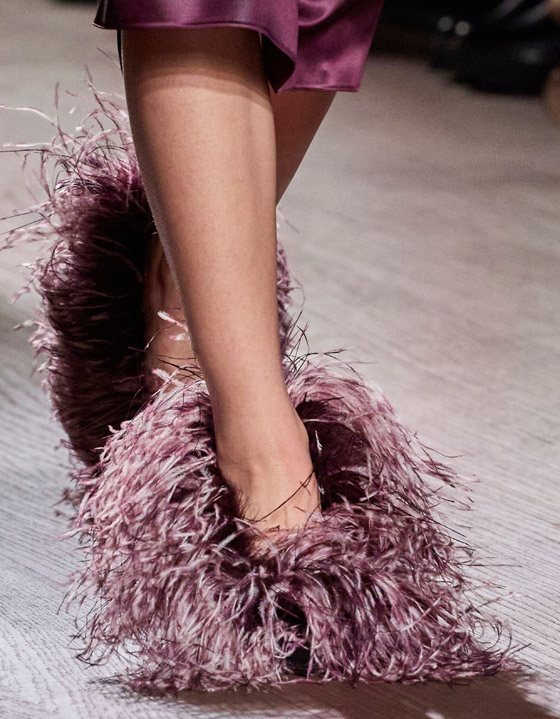 لا يمكنك مقاومة هذا التصميم الجميل من فيراغامو Ferragamo باللون البنفسجي الرائع، المصنوع بالكامل من الريش الفاخر الذي يضفي عليه لمسة من الفخامة والأنوثة. هذا التصميم الاستثنائي سيجذب الأنظار نحوك بلمح البصر، حيث يُعتبر من أبرز الصيحات لهذا الموسم. لزيادة التأثير وجعل الحذاء يبرز أكثر، يمكنك تنسيقه مع فستان قصير بسيط ليكون مركز الإطلالة. سيكمل هذا المزيج بين الريش والألوان الجريئة إطلالتك بطريقة ساحرة؛ ما يجعلها مثالية لمناسبات السهرات الخاصة والمناسبات الفاخرة.