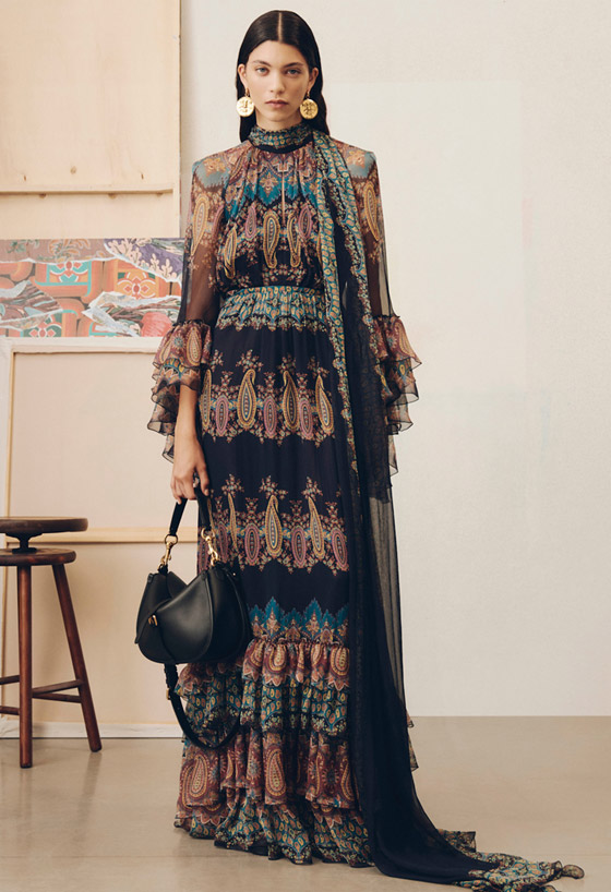 ها هي الفساتين الطويلة الماكسي تثبت حضورها من جديد في أحدث المجموعات التحضيرية لخريف 2025، فقد رصدناها بتوقيع أكثر من ماركة، ولكننا أحببنا الفستان الشيفون الأسود المصمم بأكمام تنتهي على شكل الجرس والمميز بياقته العالية وطبعة Paisley الكلاسيكية من مجموعة ماركة إيترو Etro، سيكون هذا التصميم رائعاً مع البوت الأسود الطويل المصمم بمقدمة Pointed وكعب Chunky طويل، ولمزيد من الفخامة احملي حقيبة كتف سوداء سادة مزودة بحزام طويل وقفل ذهبي، وزيني رأسك بطرحة سوداء سادة وارتدي أقراطاً ناعمة من الذهب الأصفر، وفي الأيام الباردة ارتدي فوقه معطفاً أسود تلامس حافته الكاحل.