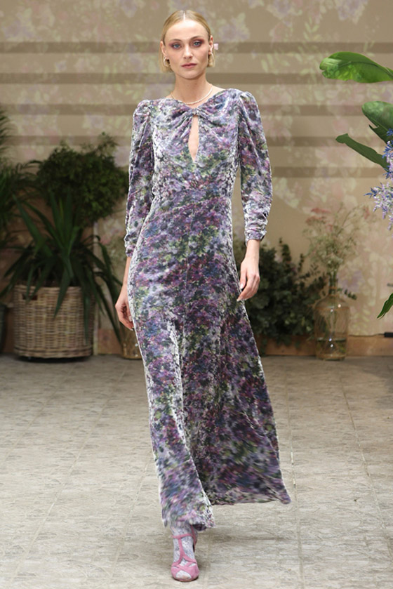 عادة ما تكون الفساتين المخمل بألوان شتوية داكنة خالية من أي طبعات، ولكن هذا العام كسرت بعض الماركات هذه القاعدة، وقدموها بألوان فاتحة وطبعات مستوحاة من الطبيعة أضفت عليها لمسة حيوية ستحبها عاشقات اللوكات المرحة اللواتي يرغبن في التأنق بالمخمل خلال النهار، سيعجبك الفستان الرمادي الطويل المزدان بأنماط الورود من مجموعة ماركة لويزا بيكاريا Luisa Beccaria، ارتدي تحته قميصاً أبيض لتحافظي على ستايلك المحتشم، وأكملي الطلة بانتعال حذاء مدبب رمادي فاتح، واختاري الحقيبة من اللون نفسه، وزيني أذنيك بأقراط Studs ناعمة من الذهب الأبيض، وارتدي ساعة من الذهب الأبيض.