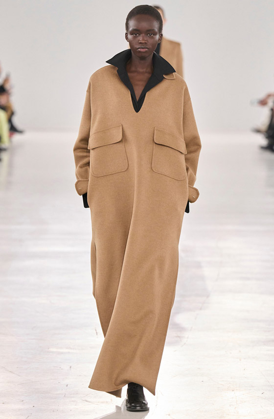 حضرت الفساتين الواسعة في أغلب مجموعات خريف وشتاء 2024، ولكن كان الفستان الصوف الجملي الفاتح من ماكس مارا Max Mara من أكثر القطع التي جذبت أنظارنا، فقد تميز بلونه الشتوي المميز والجيوب الكبيرة التي تزين الجهتين وأضفت عليه لمسة ثراء ستجعلك تستغنين عن ارتداء معطف فوقه، نسقيه مع بوت أسود طويل، وارتدي تحته قميصاً أسود سادة على غرار العارضة، وزيني رأسك بطرحة سوداء سادة، أما الحقيبة فيمكن أن تكون باللون الجملي الداكن.