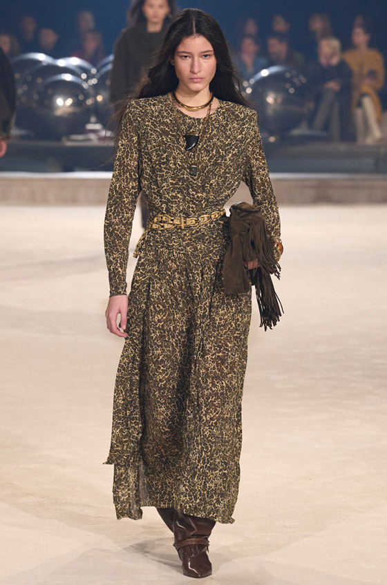 تمسكت بعض الصيحات بمكانها على مدارج العروض، ولكن ما أذهلنا هو الحضور القوي للطبعات البرية والتي زينت كل شيء هذا العام، ستتحمسين إلى اعتماد هذه الصيحة الجريئة فور أن تقع عيناك على الفستان المحتشم طويل الأكمام المزين بنقوشات صغيرة وناعمة من مجموعة ماركة إيزابيل ماران Isabel Marant، والذي ننصحك بتنسيقه مع بوت كاكي طويل، وحقيبة سويد مزدانة بالأهداب من اللون نفسه، وزيني رأسك بطرحة سوداء سادة لتحافظي على أناقة الطلة.