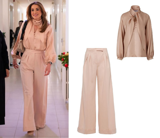 من ضمن جولاتها الأردنية، زارت الملكة رانيا راهبات الوردية في البلاد، وقد اختارت لهذه الإطلالة ملابس مريحة من دون أن تتنازل عن عنصر العصرية والأناقة. تألّقت الملكة الأردنية في هذا اللقاء بالسروال الواسع الرجلين مع قميص حرير بقصّة الوشاح باللون الوردي الخشبي من علامة MaxMara.