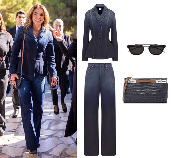 في زيارتها جامعة الأميرة سمية للتكنولوجيا، بين الإداريين، الأساتذة والطلاب، تألّقت الملكة رانيا بطقم جينز استطاعت من خلاله المزج بين الأناقة الرسمية والأسلوب اليومي الحيوي. لهذه الإطلالة، لجأت الملكة رانيا إلى علامة Dior لتختار من تصاميمها السروال والبلايزر الدنيمز وقد نسّقت لهذا اللوك حقيبة كتف Calfskin Woven Small Missy Bag كحلية اللون من ماركة Loewe. كما اختارت الملكة نظاراتها الشمسية SL 28 Metal Sunglasses من علامة Yves Saint Lauren.