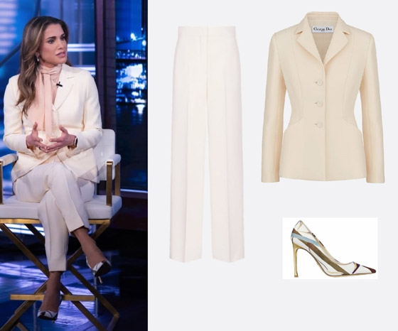 لأنّها تعي تماماً تأثير الصورة على الجمهور، اختارت الملكة رانيا لمشاركتها في مقابلة مع لينزي ديفيس على أي بي سي نيوز في نيويورك، بدلة أنيقة باللون الكريمي. من Dior، تألّقت الملكة بالبلايزر Montaigne Bar Jacket وبالسروال White Wool and Silk من الماركة نفسها، بالإضافة إلى الحذاء بالكعب العالي Abstract Print Canvas Pointed Toe Pumps من Dior أيضاً.