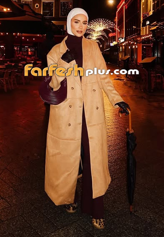 استوحي من أناقة مدونة الموضة المحجبة دلال الدوب وارتدي المعطف السويد الجملي الطويل مع إطلالة باللون البرغندي الدارج مكونة من كنزة بياقة عالية وبنطلون مرتفع الخصر بقصة Flared، وانتعلي حذاء مزيناً بطبعة النمر المتربعة على عرش الموضة هذا الموسم، وغطي رأسك بطرحة بيضاء أو بنية، واحملي حقيبة Baguette برغندية.
