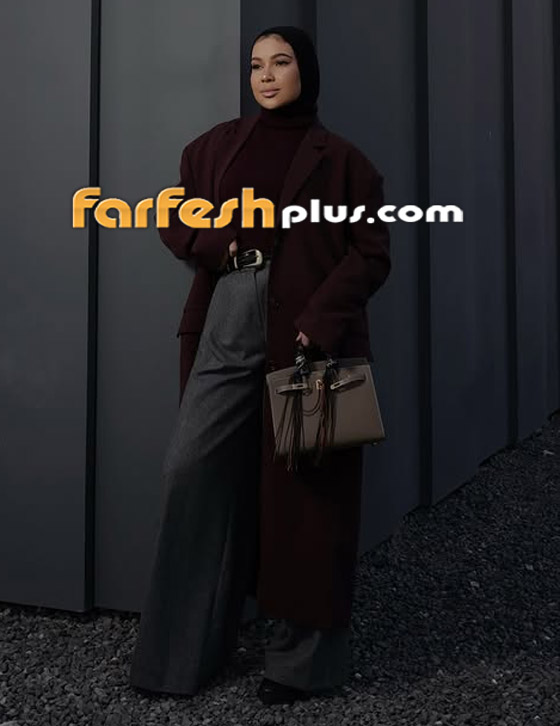 نسقي البنطلون الرمادي عالي الخصر والمصمم بأرجل واسعة مع كنزة برغندي مرتفعة الياقة، ارتدي فوقها معطفاً ميدي من اللون نفسه، وغطي رأسك بطرحة سوداء، وانتعلي حذاء مسطحاً أسود، وتممي اللوك بحقيبة ترابية اللون على غرار مدونة الموضة منة نبيل.
