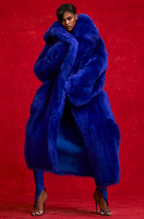 تدثّري في الموسم الشتوي من تصميم لاكوان سميث Laquan Smith بمعطف أزرق طويل من الفرو الاصطناعي، وانتعلي الصندل الفضي العالي بكعب رفيع. ويمكن تنسيق بلوزة بياقة سلحفاة مع سروال ليغينغ مطاطي من الجلد النباتي الإنديغو، بطابع مونوكروم. يتميز هذا المعطف بقَصة واسعة وهو مثالي للنحيلات.