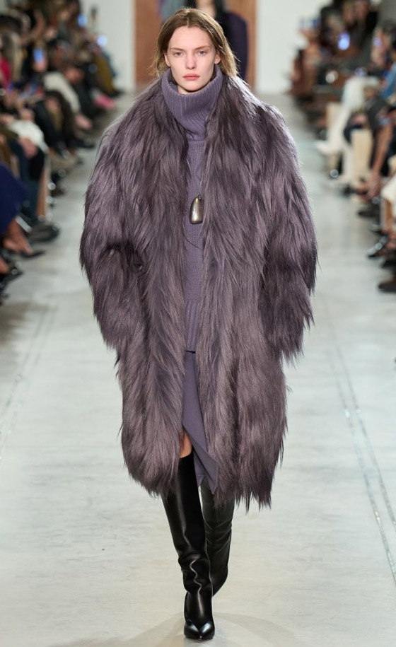 تدّثري بمعطف رمادي ذي فرو طويل اصطناعي بطول ميدي مايكل كورس Michael Kors، ويتميز بلون باستيل، ويمكن تنسيقه مع فستان صوفي طويل بياقة واسعة مع فتحة أمامية، ولا ضير من انتعال البوت الجلدي الأسود العالي. ويُعتبر هذا التصميم البيضاوي مثالياً للواتي يعانين من قوام التفاحة.