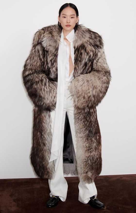 اختاري المعطف الطويل المصنوع من الفرو البيج بطابع متموّج الألوان من سلفاتوري فيراغامو من خط ريزورت 2025 Ferragamo Resort، ونسّقيه مع قميص قطني أبيض وسروال أبيض بقَصة مستقيمة واسعة. وانتعلي حذاء لوفر أسود من الجلد، وحددي الخصر بحزام رفيع؛ فموضة الأحزمة الرفيعة عادت في شتاء 2025.