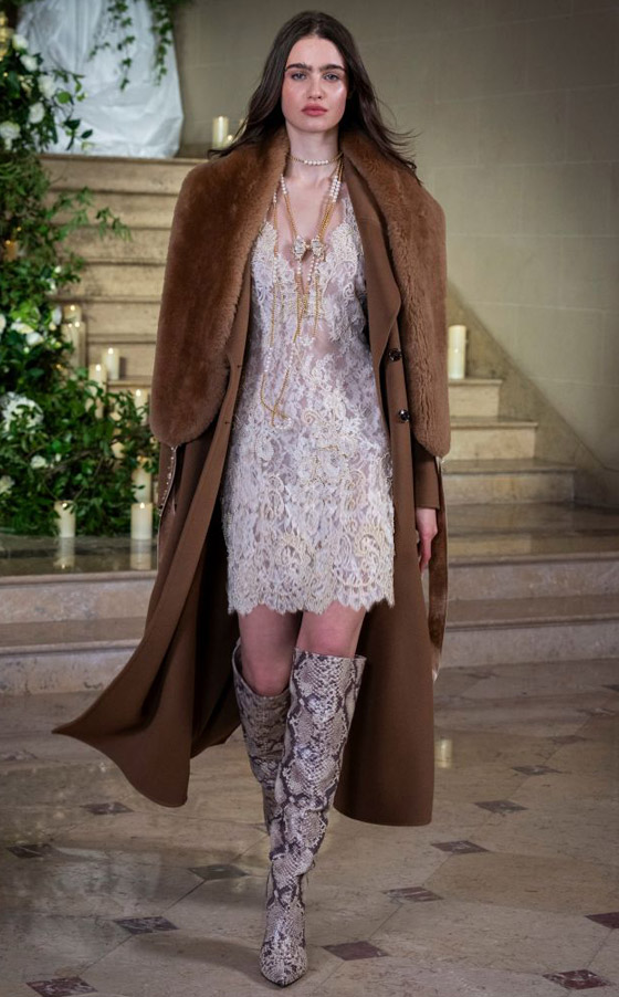 اختاري المعطف من Loveshackfancy المصنوع من الكشمير بلون بني خردلي أو كاراميل، ويزدان بياقة من الفرو ويتمتع بطول يصل إلى الكاحل، ونسّقيه مع فستان ميني ضيق من الغيبور الأبيض. وانتعلي البوت المصنوع من طبعات جلد الأفعى البري. اعتمدي هذه المعاطف التي تتسم بياقة عريضة، إذا كان قوامك على شكل الكمثرى؛ لتجذبي النظر إلى الجزء النحيف من قامتك.