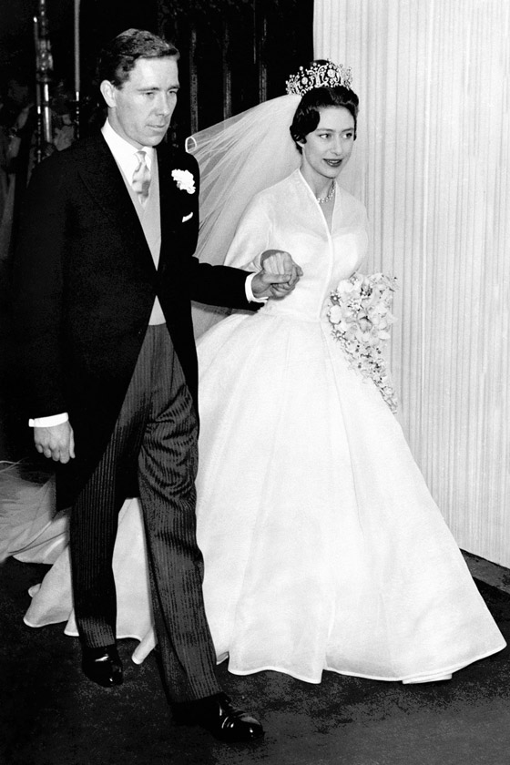3. فستان زفاف الأميرة مارغريت: لم يكن فستان الأميرة مارغريت الأخت الصغرى للملكة إليزابيث الثانية أقل روعة من فستان أختها، فقد كان حفل زفافها من أنتوني أرمسترونج جونز الذي أقيم في دير وستمنستر في عام 1960 حديث الصحف لأسابيع طويلة. ارتدت العروس ثوب زفاف من الأورجانزا الحريري المصمم من قِبل نورمان هارتنيل - المصمم نفسه الذي صمم فستان الملكة إليزابيث – وقد استهلك الفستان 30 متراً من القماش، وارتدته الأميرة مع تاج مرصع بالجواهر.